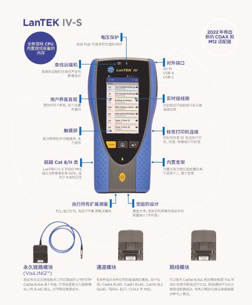 款铜缆和光纤认证测试仪,可以在7秒内测试和保存一个Cat6a链路,并升级到Cat8.1和Cat8.2的链路测试,包括TCL和电阻不平衡测量。LanTEK IV-S 将证明您的投资-可支持高至3000MHz的带宽频率,轻松应付下一代ISO/TIA/GB的测试标准。